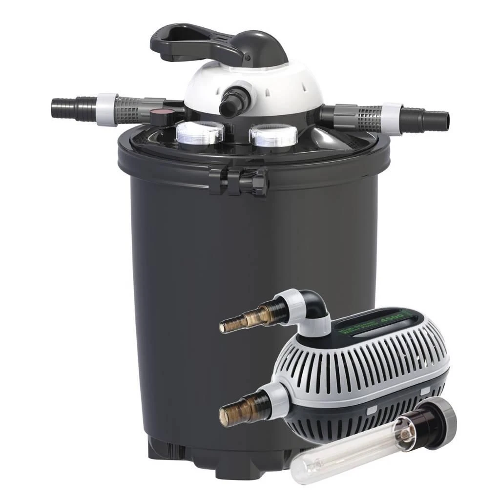 Het Velda Clear Control drukfilter is zeer effectief, omdat het systeem door de afbraak van zwevend vuil een uitstekend medium is voor de aangroei van bacteriën. Het filter kan prima gebruikt worden vóór een waterval. De High-Stream vijverpomp heeft een grote capaciteit bij een laag energieverbruik.